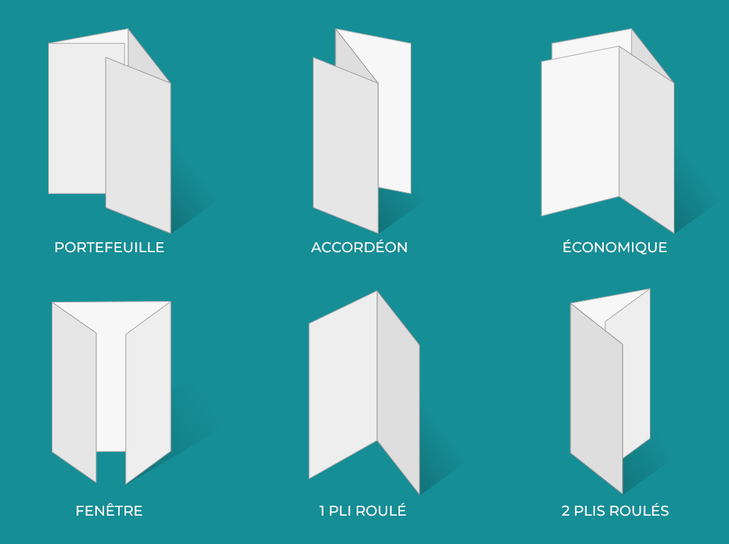 Le dépliant est un support de communication et de vente idéal pour annoncer un événement, présenter une entreprise, ses nouveautés, ses produits, ses services... Nous vous proposons un large choix de type de papier et de pliage pour satisfaire toutes vos demandes Vous souhaitez un dépliant avec un papier épais au-delà du 170 g/m² , merci de consulter les produits Plaquettes commerciales »